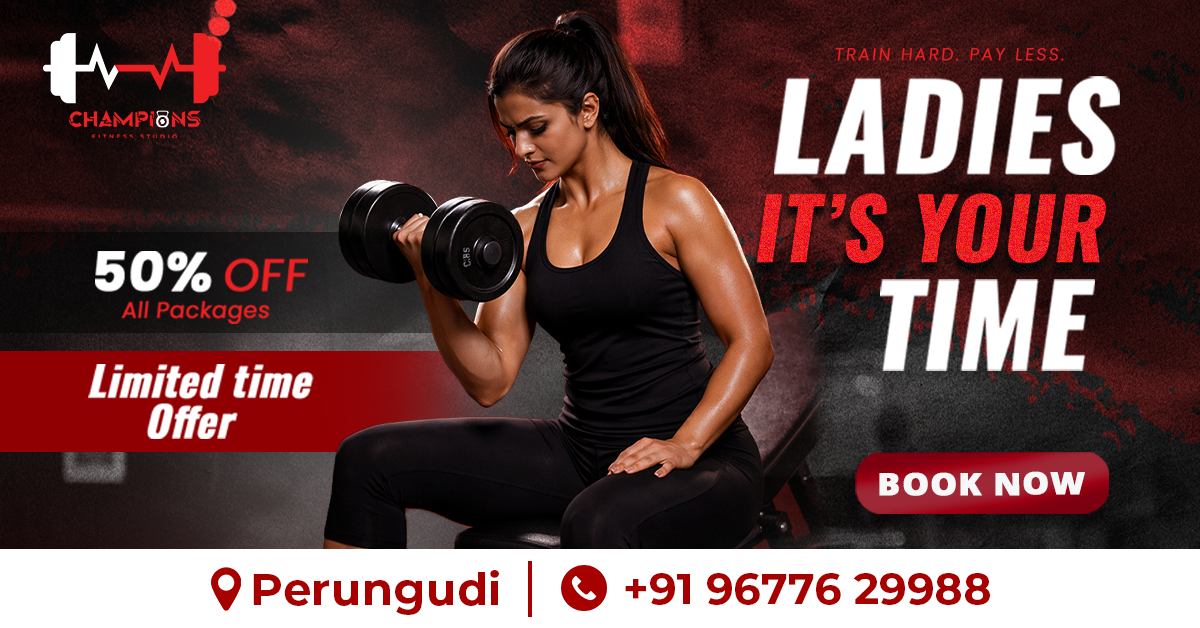 Champions Fitness Studio brings you a Special Women’s Day Offer – Flat 50% OFF on all gym packages. Whether your goal is weight loss, strength training, or staying fit, our expert trainers and fully equipped gym will help you achieve it.